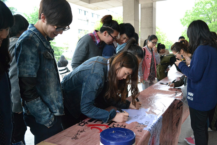 学生记者团团长徐嘉旖说:“当我们听到雅安地震这个消息时,内心除了伤痛以外,更多的是想为受灾同胞做些力所能及的事情。这次的祈福签名活动,是要让灾区人民知道,我们是一家人,我们一直都在这默默担心和关注,我们与雅安同在!”“这样的祈福活动让我们更深刻地感受到灾区的痛。我们在这边祈福,为雅安祈福,为受难同胞祈福。”文管系12展览班何琳同学这样说。