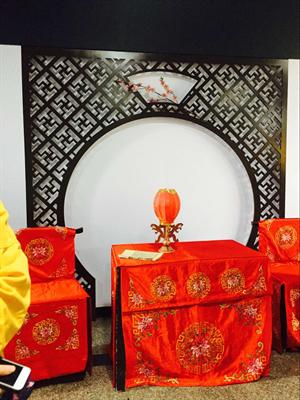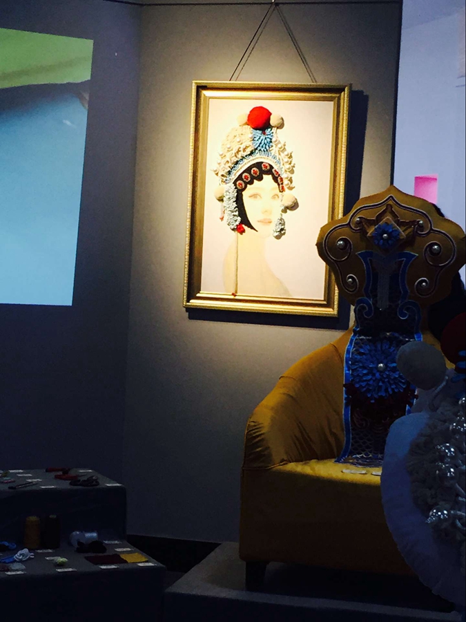 右手边是昆剧中常见的木头座椅,套着大红褂子,褂子上绣的花纹也是极为精细,背后的布景仿的是从前人家的厅堂。转个身,又看着了一些精美的头饰和一个个样式各异的座椅,它们后面的墙上挂着两幅青衣女子的画像,那带着妆的美丽模样叫人好不心生喜欢!墙的中间恰到好处地摆了一块小银幕,放映着制作这些小座椅的步骤。