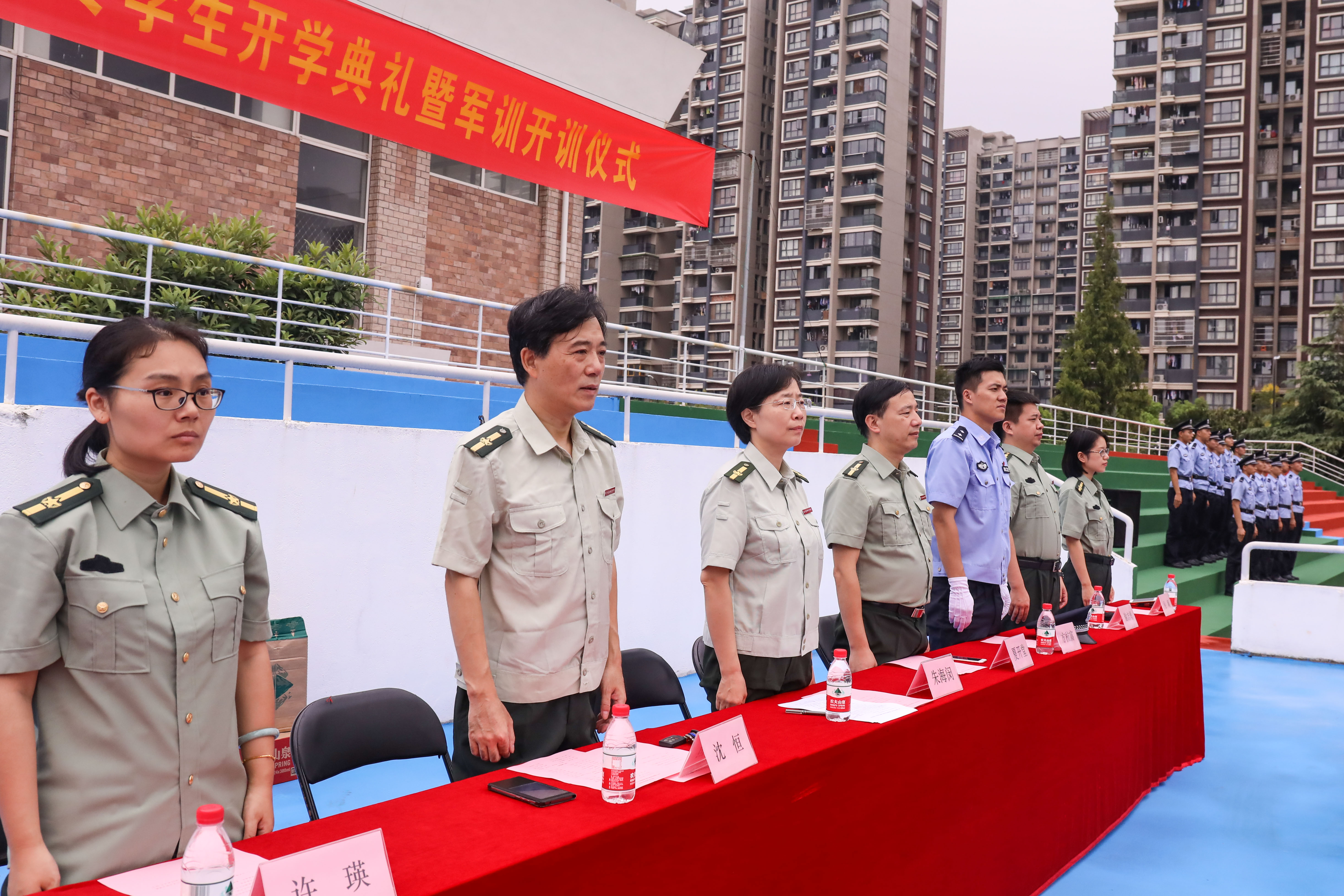 典礼在庄严的升国旗仪式中拉开帷幕。朱海闵作开学典礼暨军训动员讲话,她首先代表浙艺全院师生员工对浙江警察学院的领导及全体教官表示诚挚的感谢,同时对跨入浙艺学习的300多名新同学致以热烈的欢迎和衷心的祝贺。她讲到,同学们所就读的戏剧影视表演、音乐表演和舞蹈表演等专业一直是学校的品牌,是浙江省的重点专业和优势特色专业,戏曲表演(越剧)专业还被文化部、教育部和国家民委评定为首批“全国职业院校民族文化传承与创新示范专业点”,2017年学校成功入选了浙江省优质高等职业院校建设计划。她希望同学们尽快融入浙艺大家庭,以浙艺前辈名师和群星璀璨的优秀毕业生们为榜样,在浙艺开启梦想,在学艺的同时培养自己良好的政治素质、道德品质、法治意识和行为习惯,培育自己积极健康的人格和良好心理品质,热爱党热爱祖国热爱人民,自觉践行社会主义核心价值观,不断增强文化自觉和文化自信,成为一名有家国情怀、社会责任和真才实学的合格人才。朱海闵对新生军训提出了几点要求:尊重教官,严格训练,战胜困难;思想上高度自觉,行动上雷厉风行;要坚决服从管理,自觉锤炼毅力意志,以一名军人的标准严格要求自己;团结协作,互帮互助,以饱满的精神和认真的态度参加军训,取得入学第一课的优异成绩。