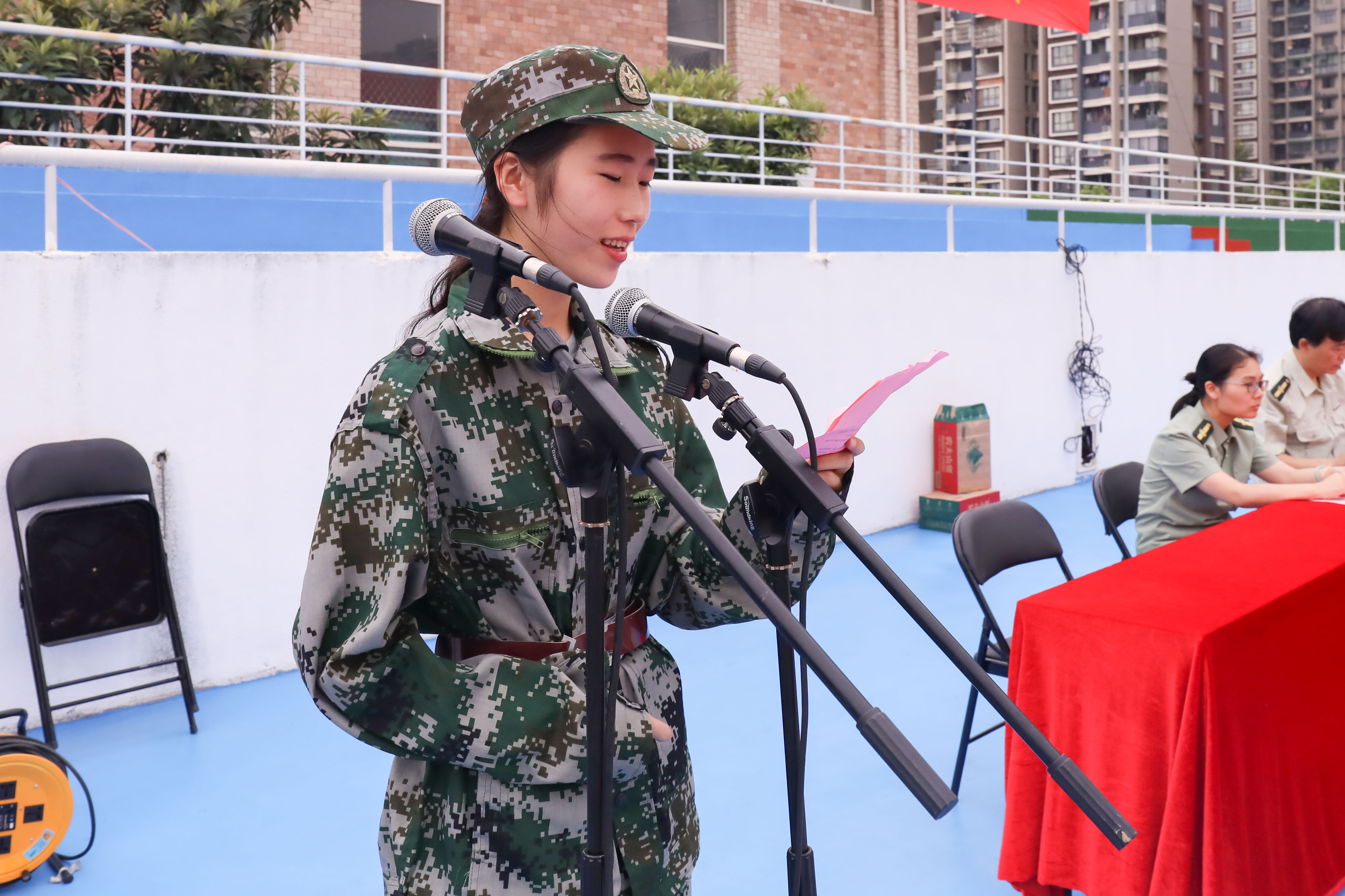 2017级音乐系声乐一贯制班的俞懿珈同学作为新生代表发言:“作为艺术生,我们深知学艺的艰辛和不易,那些年为了追求我们的浙艺梦,我们一句句、一遍遍地反复练习。现在,我们梦想成真,怀着激动和自豪的心情,肩负家长的期望来到浙艺就读,这里将是我们梦想开始的地方,我们将在这里扬帆起航……”她代表所有新生向教官们致以崇高的敬意和深深的感谢。