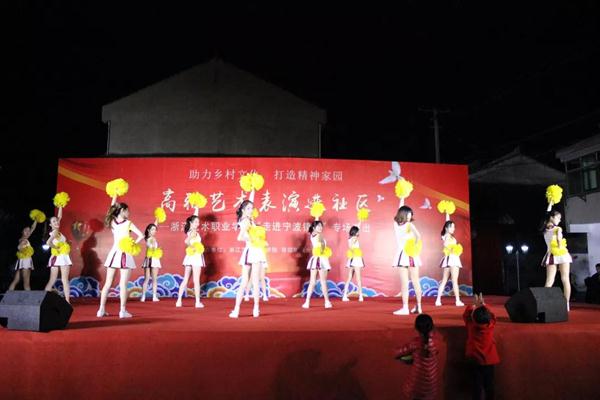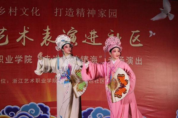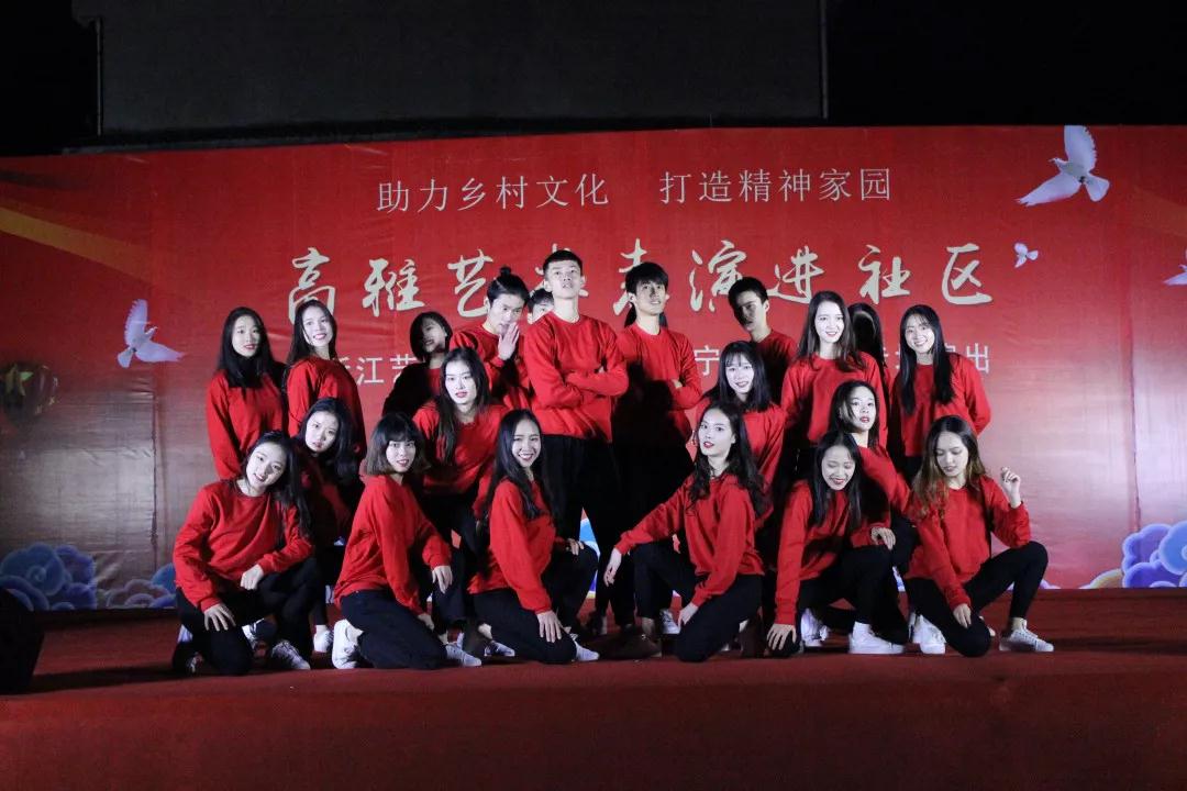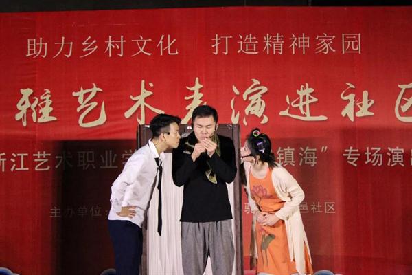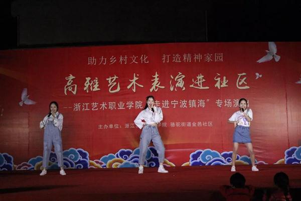 开场《啦啦操》舞出了青春与希望。男声独唱《我爱你中国》、小品《妈妈我想你》《安全感》《私房钱》、歌舞《麻烦少女》《芳华》《永远十八岁》、情景朗诵《太阳与月亮的对话》等精彩节目轮番上演,向社区群众带去了浙艺学子的问候。越剧《十八相送》《碧玉簪·送凤冠》绘声绘色的表演深受当地百姓喜爱。金邑社区的阿姨们也带来了精彩节目《太极刀》《太极功夫扇》《凤阳花鼓》。伴随着活力四射的群舞《On The Floor》,演出画上了圆满句号。