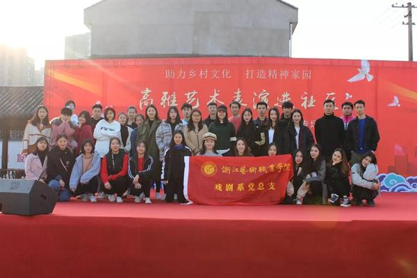 2018年,戏剧系共开展“文化礼堂”演出共10场,先后与长兴县文广新局、乌镇文体站、宁波镇海金邑社区签订“送戏下基层”定点演出服务协议。戏剧系将继续发挥专业优势,以农民群众在精神文化生活、思想道德建设层面的需求为出发点,努力创排针对性节目,将新农村建设中的好人好事、喜人喜事与课堂教学紧密结合起来,送戏进村、送文化进村,进一步助推基层文化建设。