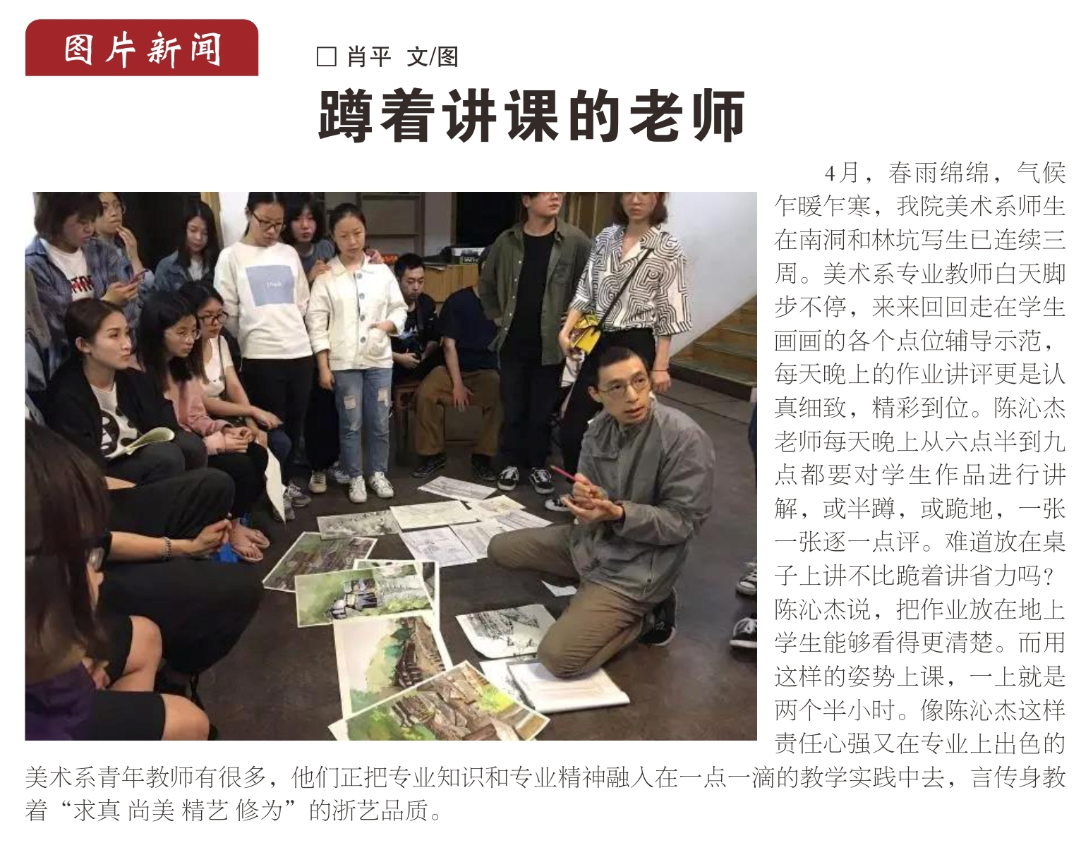 时间回到2017年4月。当时肖平担任美术系组织员,负责带领学生一年两次外出开展采风写生活动。那次,美术系师生在浙南温州的南洞和林坑写生已连续三周。老师们白天脚步不停,来来回回地走在学生写生的各个点位辅导示范,每天晚上的作业讲评更是认真细致。青年美术教师陈沁杰每晚都要对当日的学生作品进行讲解,因为桌子小,他担心20多个学生围着会看不见,便索性半蹲在地上,一张一张地逐一点评,时间久了,干脆跪着为学生讲解。这样的情形也许一次两次无所谓,但是肖平经常见到陈老师用这样的方式为学生上课,每晚都是从6点半持续到9点左右。采风写生的周期通常是持续两到三周时间,陈沁杰每晚长时间不辞辛劳地蹲着为学生上课的举动深深感动了在一旁观看的肖平。有一天晚上,她拿起相机默默拍下了这每晚都会上演的感人一幕,温暖的瞬间被定格了。