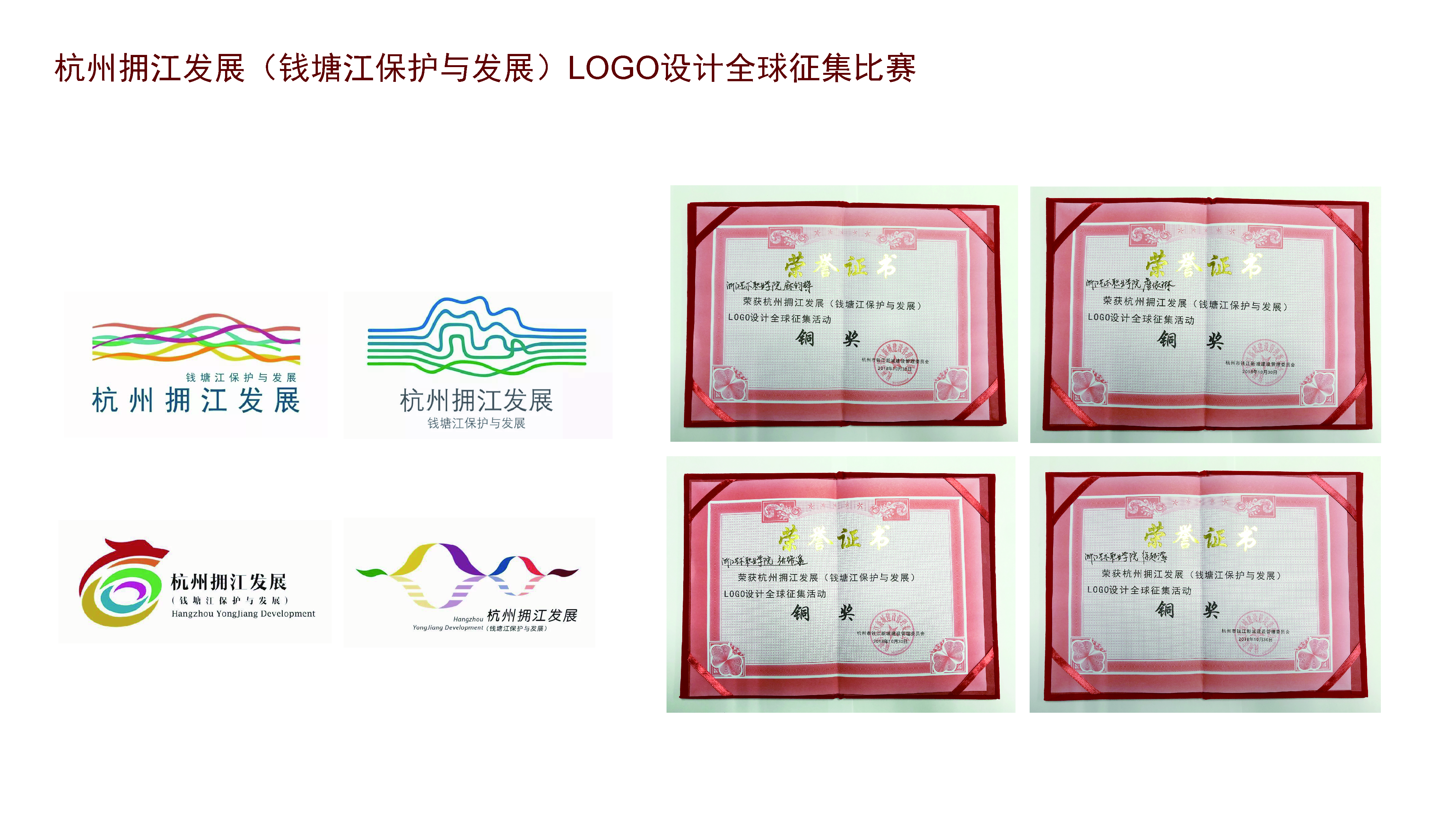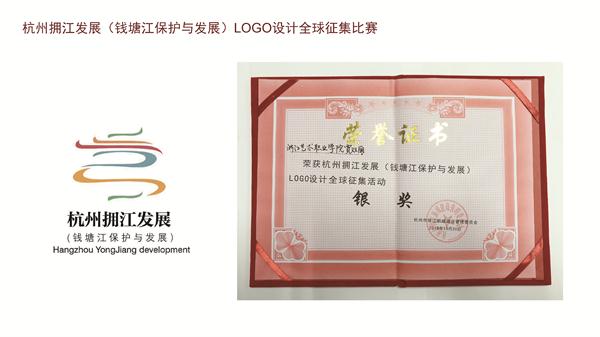 为进一步做好拥江发展工作,2017年11月,杭州市出台了《关于实施“拥江发展”战略的意见》,杭州市钱江新城建设管理委员会于2018年5月向全球征集杭州拥江发展(钱塘江保护与发展)logo设计方案,并着重邀请浙艺美术系师生参与此次项目设计。美术系广告设计与制作专业商易文、娄旻两位教师组织16广告班学生参加了标志征集活动,利用课外时间指导学生设计实践,共投稿提交了25个标志方案。通过专家评审与网络投票的层层筛选,比赛共获得银奖1名(奖金8000元),铜奖4名(奖金各1000元),该征集活动所有奖金12000元全部发放给学生个人。