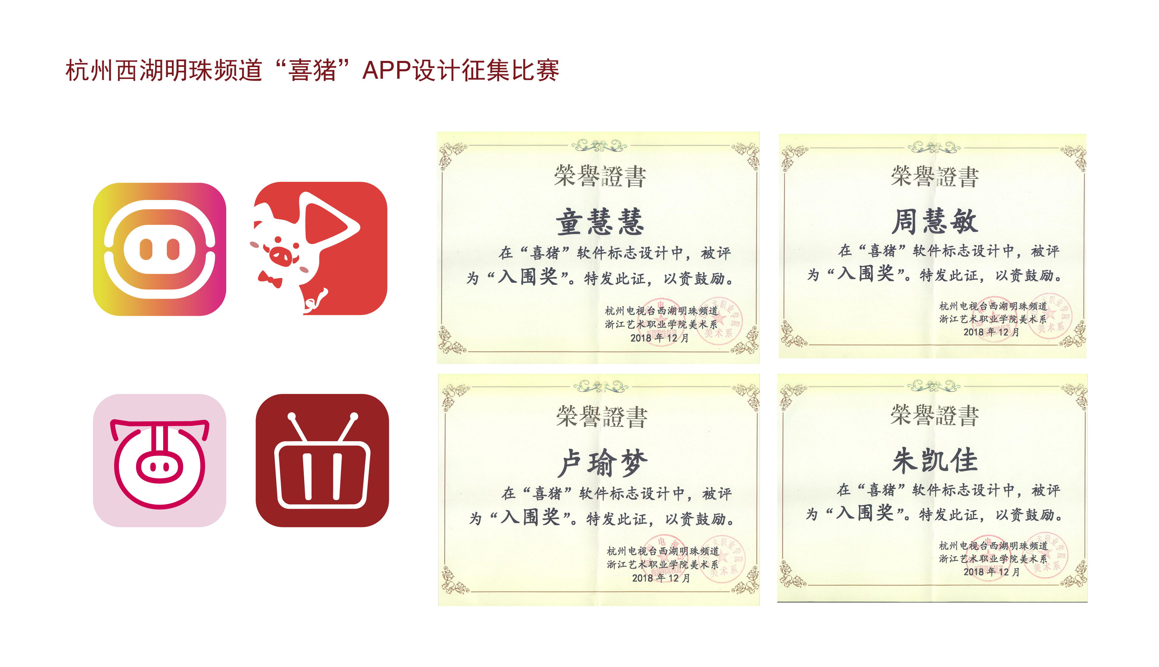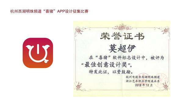 2018年11月,杭州西湖明珠频道“喜猪”App整体VI项目委托浙艺美术系进行设计。17广告1班的同学们在陈溢之老师的带领下,设计出75件作品参赛,经西湖明珠频道评选,共推出五个优秀方案,授予1项“最佳创意设计奖”和4项“最佳入围奖”。其中,“最佳创意设计奖”为本次项目设计的中标方案。该次项目设计所获设计(奖励)费由杭州西湖明珠频道直接发放给学生个人。