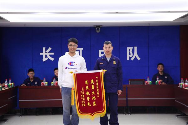 在中队消防战士的带领下,师生还一起参观了消防车,并与车上的消防器材“零距离”接触,聆听了战斗服、液压破拆组器材、无齿锯等消防器材的使用方法,收获满满。音乐系辅导员陈宏为长河中队送上锦旗,致以崇高的敬意。