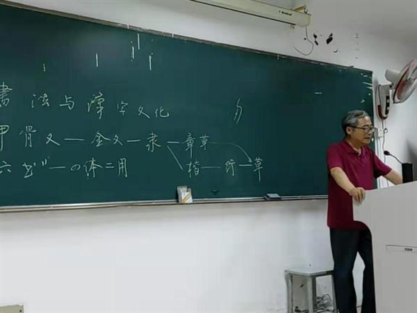 讲座上,杨宝林教授从中国汉字的发展演变史出发,探索书法与汉字文化的关系。详尽阐述了中国文字从甲骨文到草书的演进历程,以及篆、隶、楷、行、草五种字体的用笔,结构以及美学特征。并指出汉字的创制基本上是一个观物取象的过程,而汉字的发展则是一段图画文字的象形特征逐渐退化、而表意功能不断完善的历史。