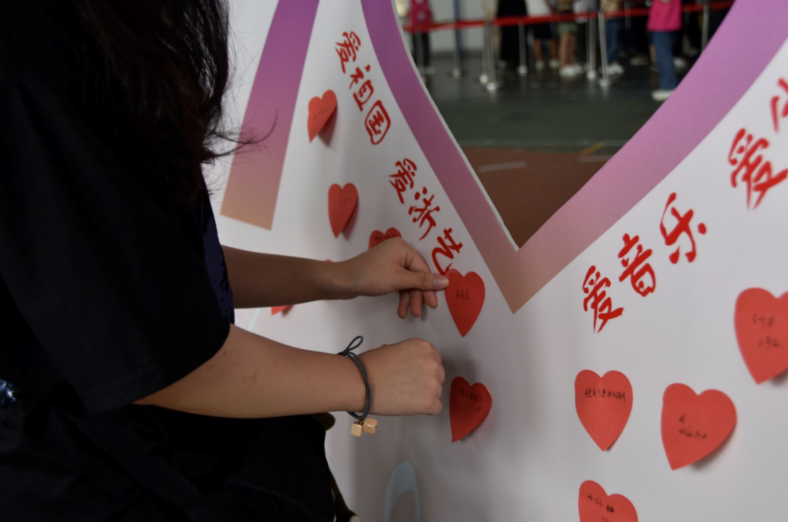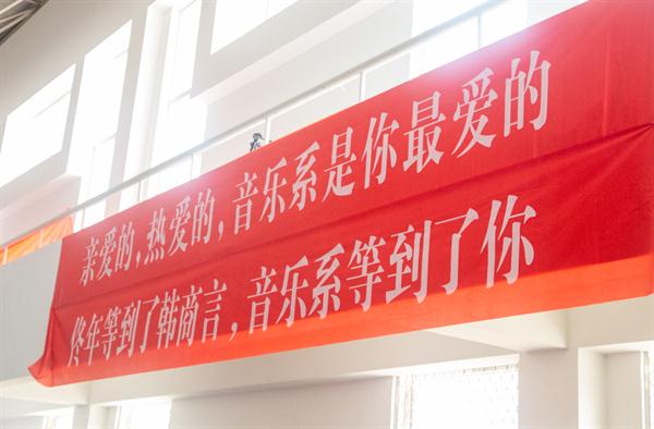 迎新现场,“亲爱的,热爱的,音乐系是你最爱的”“佟年等到了韩商言,音乐系等到了你”的红色迎新横幅格外醒目,热情的标语彰显着青春的气息。