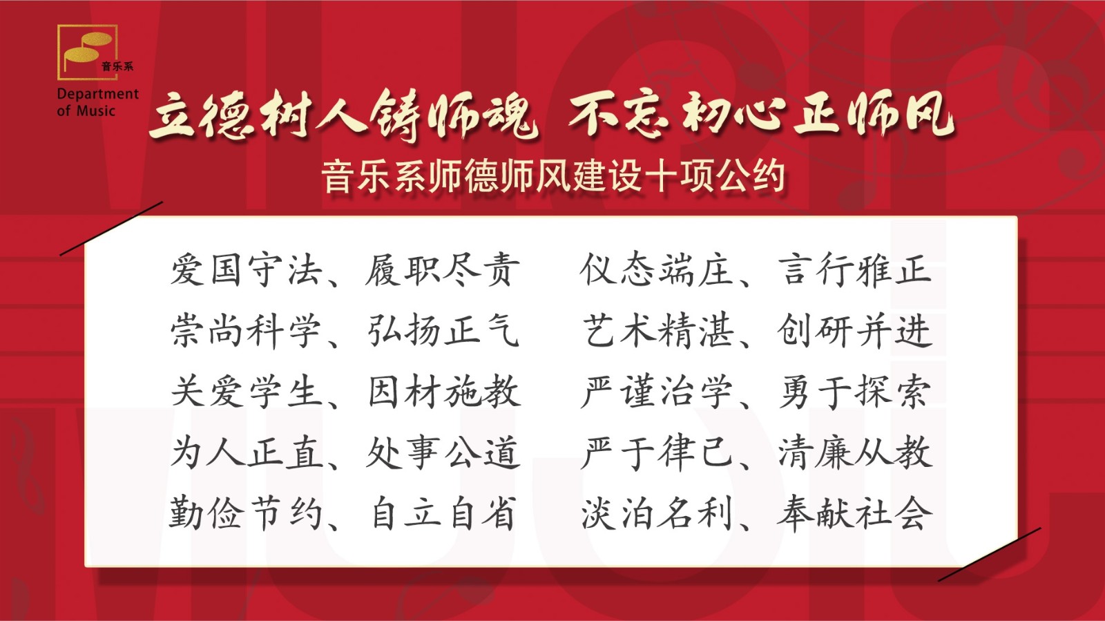 为全面贯彻落实习近平总书记关于加强教师队伍建设的新思想新理念新要求,音乐系决定在2020年以及未来更长的一段时间内,开展“立德树人铸师魂 不忘初心正师风”师德师风建设专项行动。11月12日,音乐系在图信中心报告厅举行师德师风建设专项行动启动仪式。校党委书记薛亮出席会议并讲话,音乐系全体教职工参加。