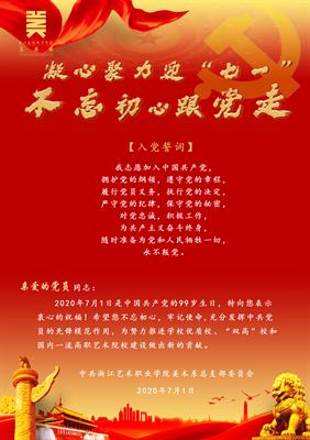 活动内容有:71日,美术系党总支为每位党员送上专属电子贺卡,共庆党的生日;党员教师进寝室,结对学生助成长。6月底到7月初,美术系党总支联合校党委宣传部党支部、党政办公室党支部开展党员教职工进寝室结对活动;7月中旬,美术系党总支将组织教职工党员,送文化到富阳区银湖街道文化礼堂,举行美术作品展览等。