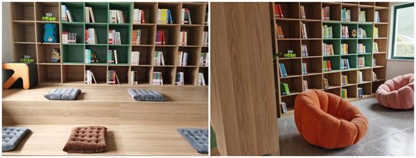二层阅读空间,以一个大的沙龙空间为主。考虑到开展沙龙活动的灵活性,设计阶梯式小退台,设置可随活动人数自由组合的阅读位,并在一侧设置相对独立的亲子阅读区域,另一侧设置儿童之家。