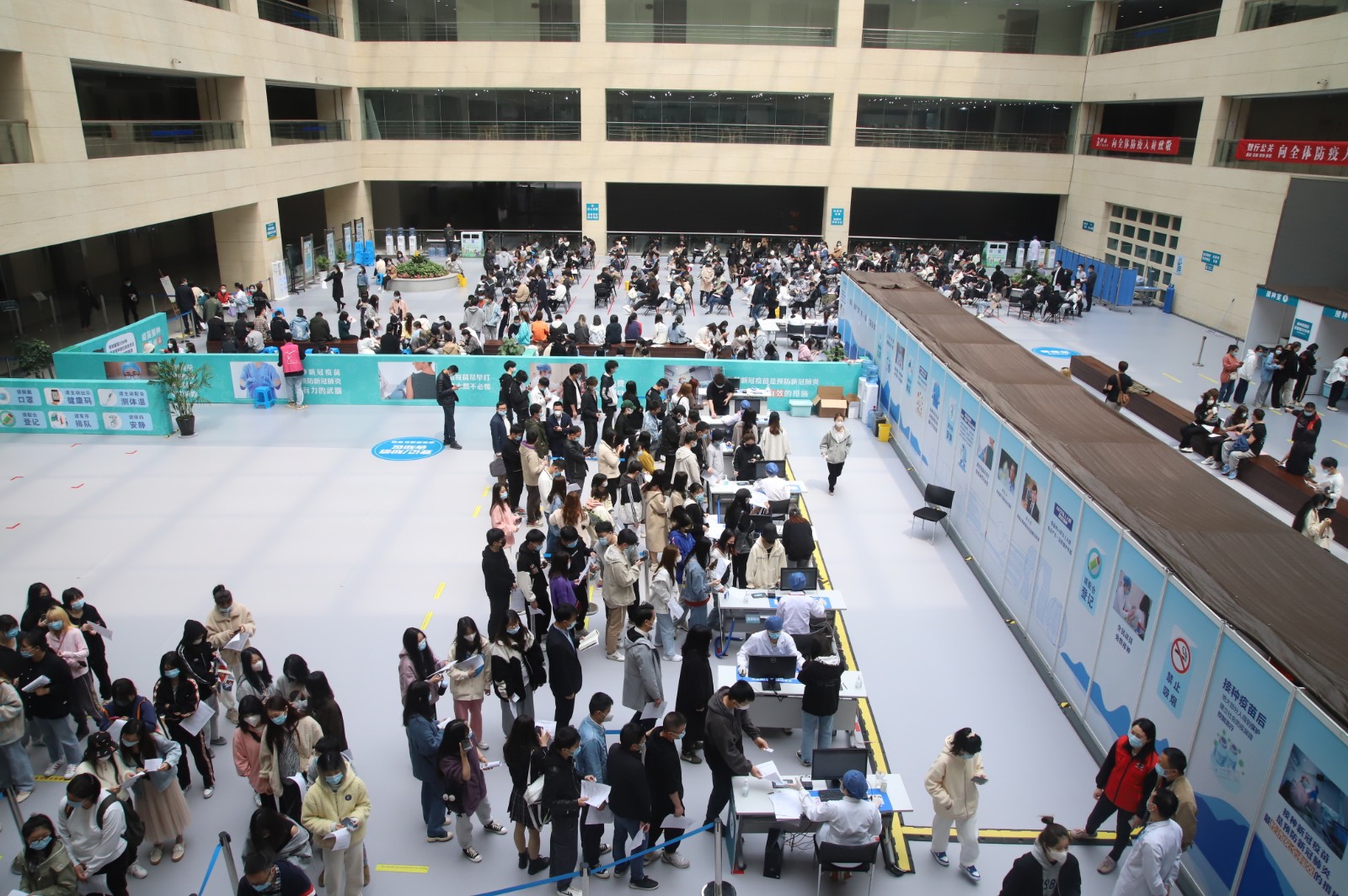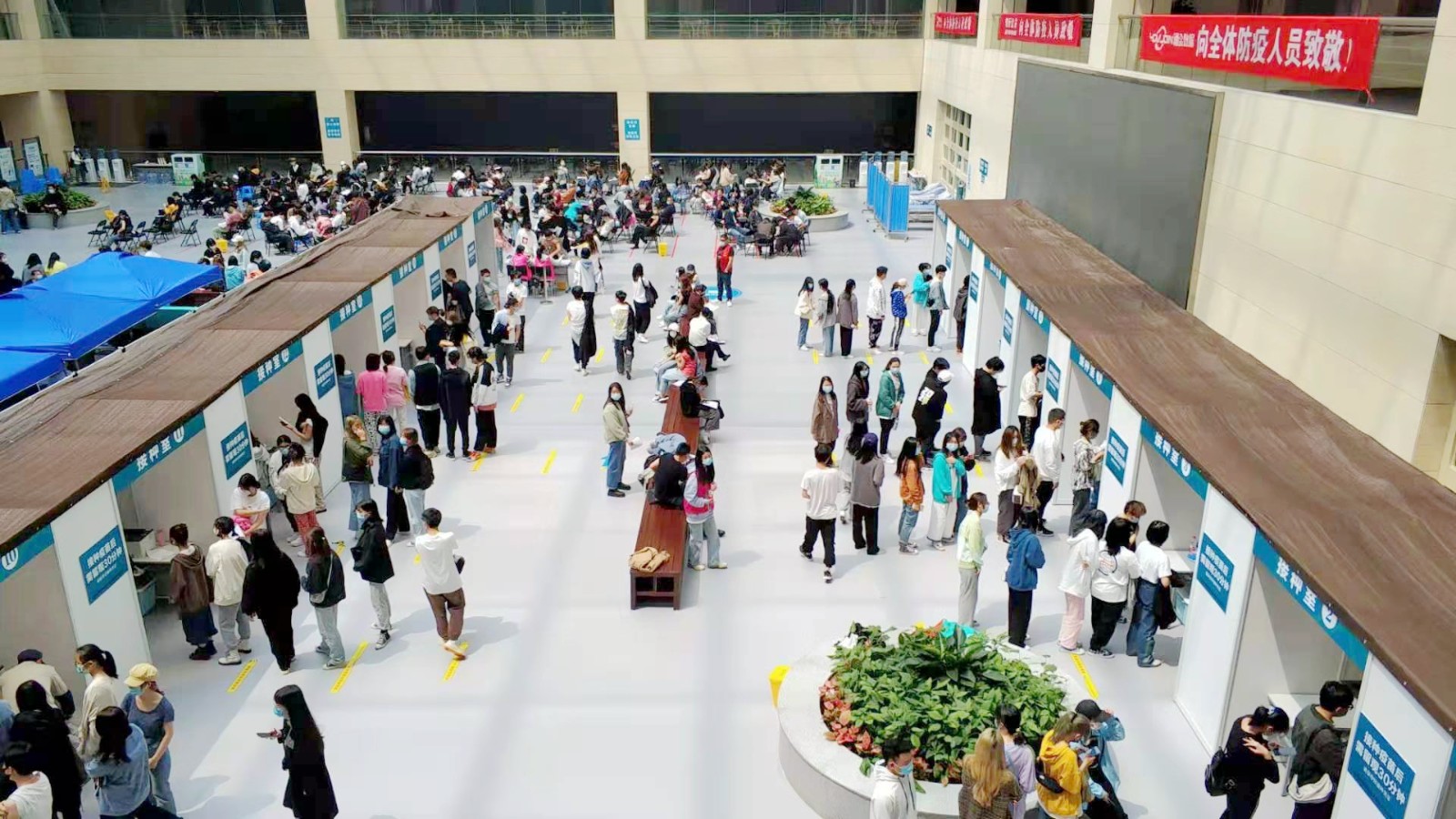 方舱临时接种点按照流程设置了多个功能区域,进出都是单向通行,设置有多条引导咨询通道,12个预检台、16个接种室、上百个留观座位,确保接种工作顺利进行。