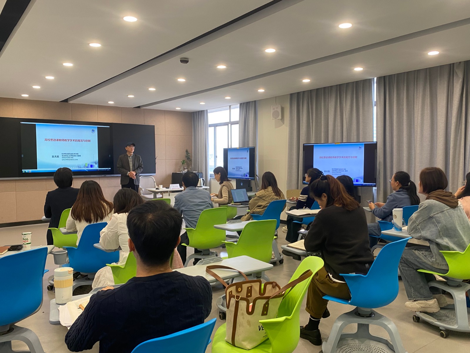为深入贯彻落实习近平总书记关于高校思政工作系列讲话精神,进一步提升思政课教师教学科研能力和素养,11月8日下午,马克思主义学院开展科研提升培训,特邀杭州科技职业技术学院马克思主义学院院长吴太胜教授作《高校思政课教师教学学术的规范与创新》专题讲座,全体马院教师、附中政治课教师代表参加培训。