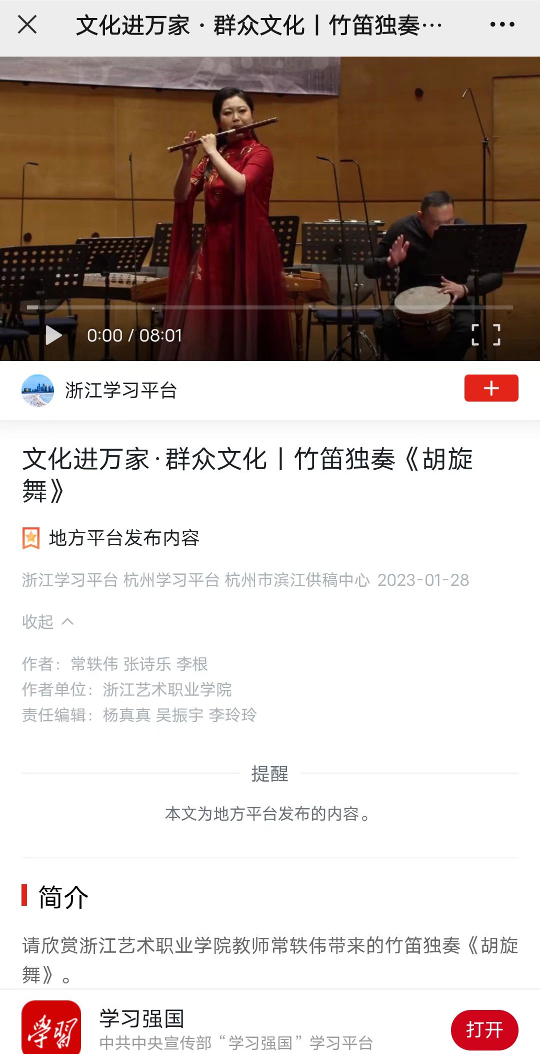 学习强国浙江平台:文化进万家·群众文化丨竹笛独奏《胡旋舞》