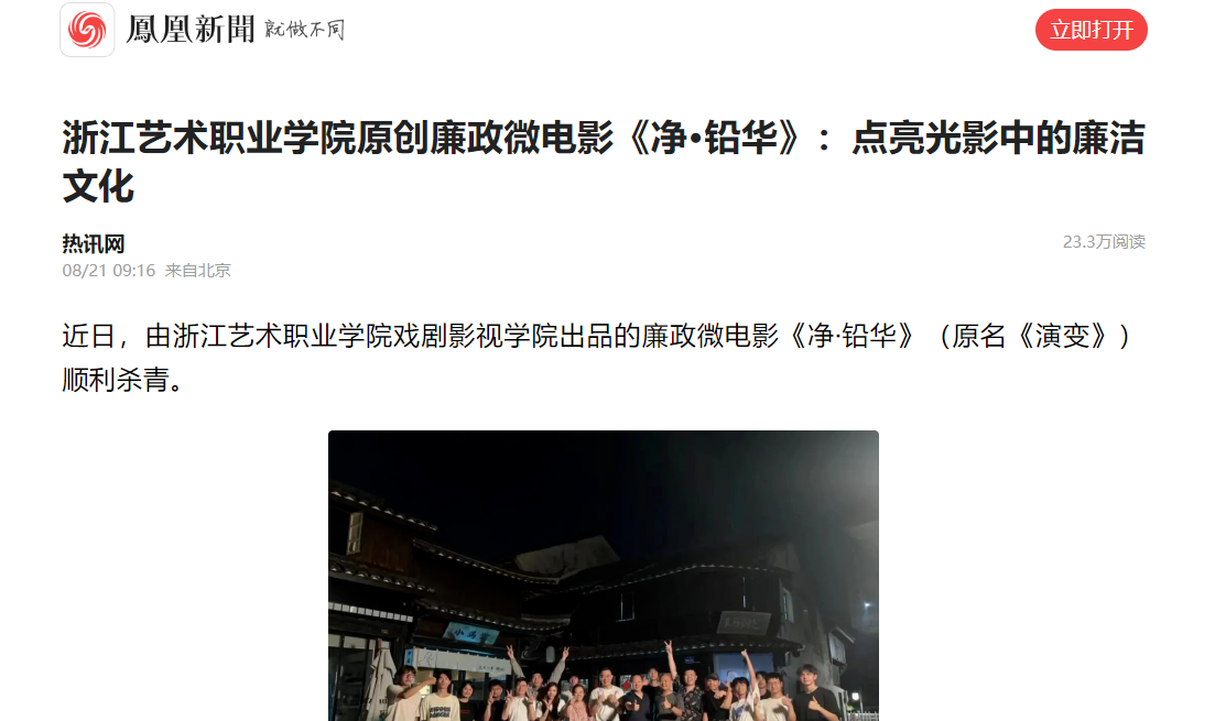 微电影《净·铅华》由浙艺戏剧影视学院创作中心牵头,是学院始终坚持理论与实践并重的教育理念、面向市场输送影视精品、鼓励学生从课堂“走出去”的又一次有力举措,对学院进一步打造校企合作新模式、全面深化产教融合具有借鉴意义。接下来,《净·铅华》将角逐第五届“玉琮杯”清廉微电影微视频大赛,并陆续登陆各网络视频平台播出。