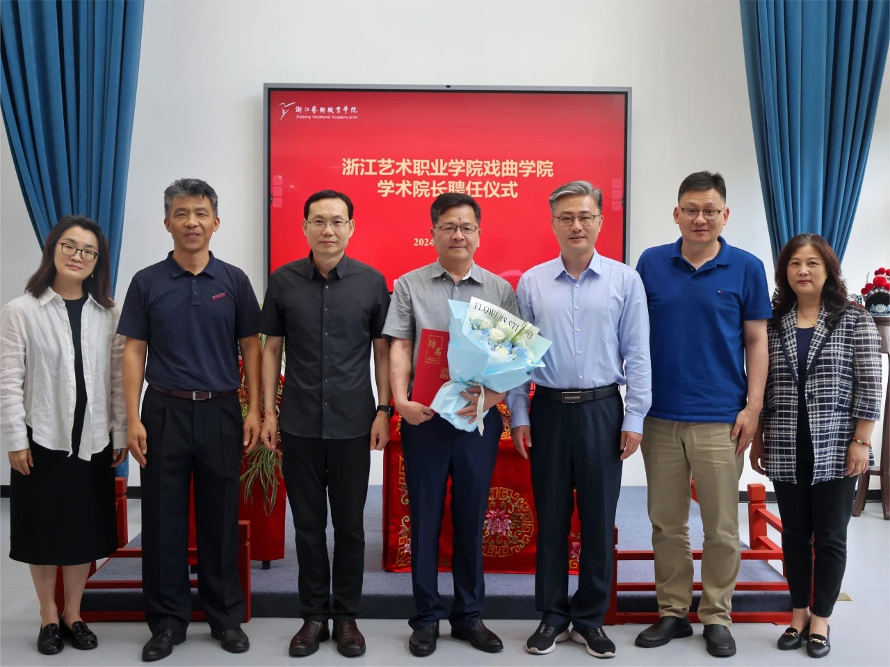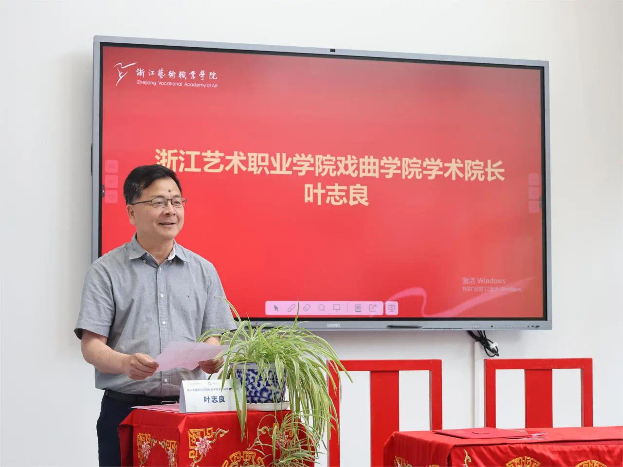 施俊天与叶志良签订聘任协议并为其颁发聘书,戏曲学生代表送上鲜花,表达了对学术院长的热烈欢迎。